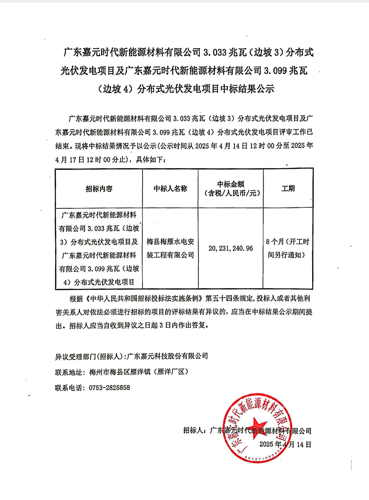 《廣東嘉元時代新能源材料有限公司3.033兆瓦(邊坡3)分布式光伏發(fā)電項目及廣東嘉元時代新能源材料有限公司3.099兆瓦 (邊坡4)分布式光伏發(fā)電項目中標結果公示》
